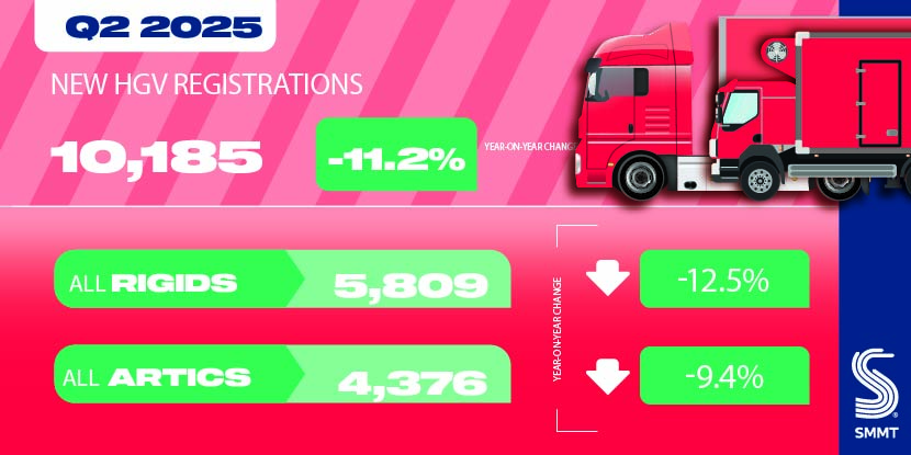 Heavy goods vehicle (HGV) registrations fell by -11.2% in the second quarter of 2025, with 10,185 new trucks joining UK roads, according to the latest figures published today by the Society of Motor Manufacturers and Traders (SMMT).