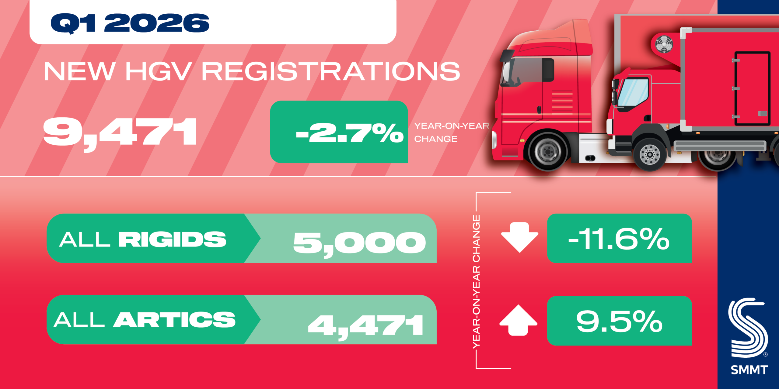 New heavy goods vehicle (HGV) registrations declined by -2.7% in the first quarter of 2026 with 9,471 new trucks joining UK roads, according to the latest data published today by the Society of Motor Manufacturers and Traders (SMMT).
